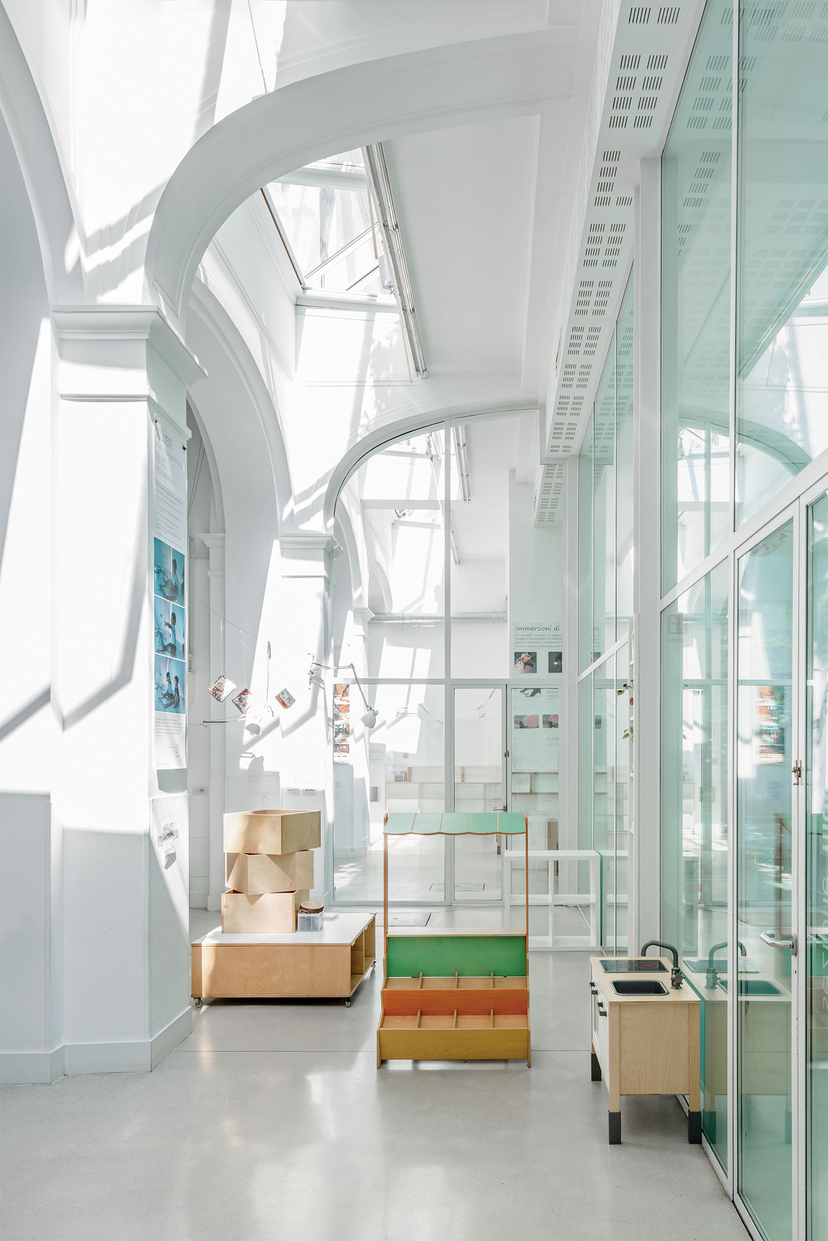 Nello spazio che originariamente era adibito a ospedale, poi teatro e cinema in uno storico palazzo di fine Ottocento nel centro di Milano, vive oggi l’asilo Clorofilla che accoglie bambini dai sei mesi ai sei anni. Il piano terra è caratterizzato da una grande piazza coperta su cui si affacciano le aule, un progetto di CLS Architetti, sull’idea di Cinzia d’Alessandro e Giovanna Gulli, con la consulenza di Reggio Children e la ristrutturazione affidata all’impresa Ecoedile Srl. Un giardino chiuso dalle grandi vetrate con un grande albero si protende verso la terrazza del piano superiore intorno al quale è prezioso immaginare i bambini fare dei viaggi negli spazi interstellari al ritmo delle parole di Gianni Rodari. Tanto spazio e tanta luce per insegnare ai più piccoli il “diritto al bello”. Le sette aule di 45 mq ciascuna sono state realizzate con materiali e dettagli a seconda delle età. Cucina con vista e una piscina per piccini e mamme completano gli spazi che, è il caso di dirlo, vengono realizzati a misura di bambino.